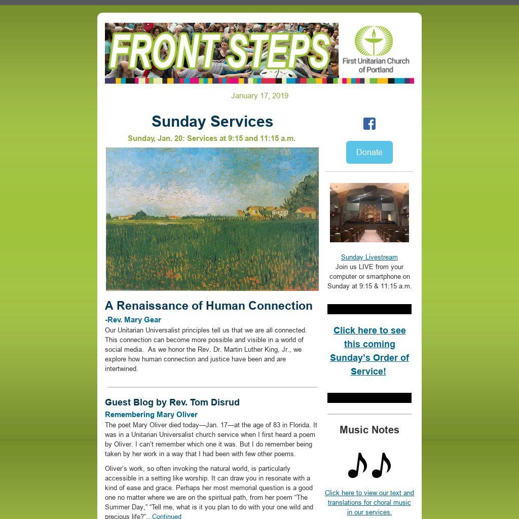 Do You Have an Item for E-news and/or the Sunday Bulletin?If you have an item you’d like published in our weekly Front Steps (eNews) or the Sunday Bulletin, please submit it to: