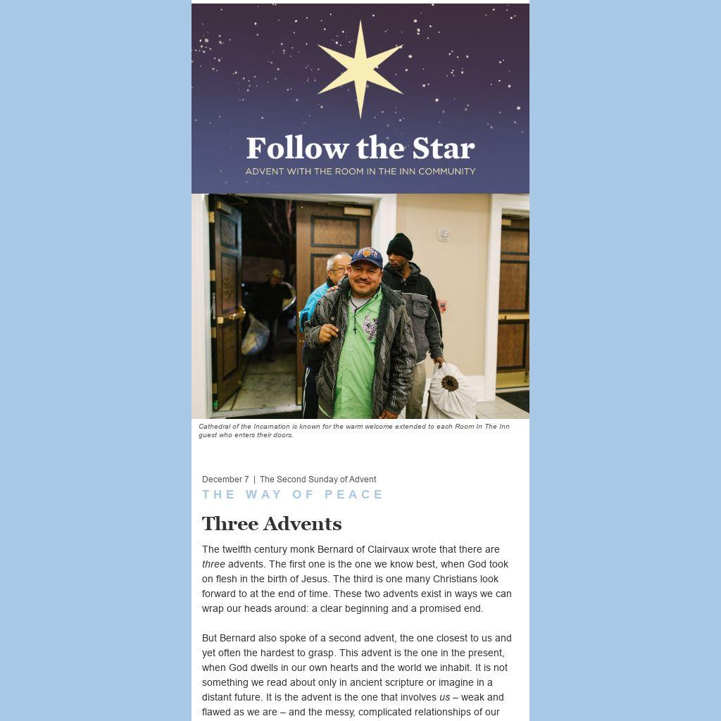 One of my favorite quotes about Room In The Inn comes from Carla Bellenfant, a volunteer from First Baptist Church of Goodlettsville. In a documentary interview, she laughed as she talked about her experience: “When I started, they would open the door and they would come in and I would think, gee, they are scary looking! Some of them are big and hairy and dirty and scary. And God would whisper in my ear, ‘Yeah! And welcome them in!’” Carla had recognized the second advent. Christ was at the door, looking big and hairy and dirty and scary, and the Christ in Carla welcomed them in.