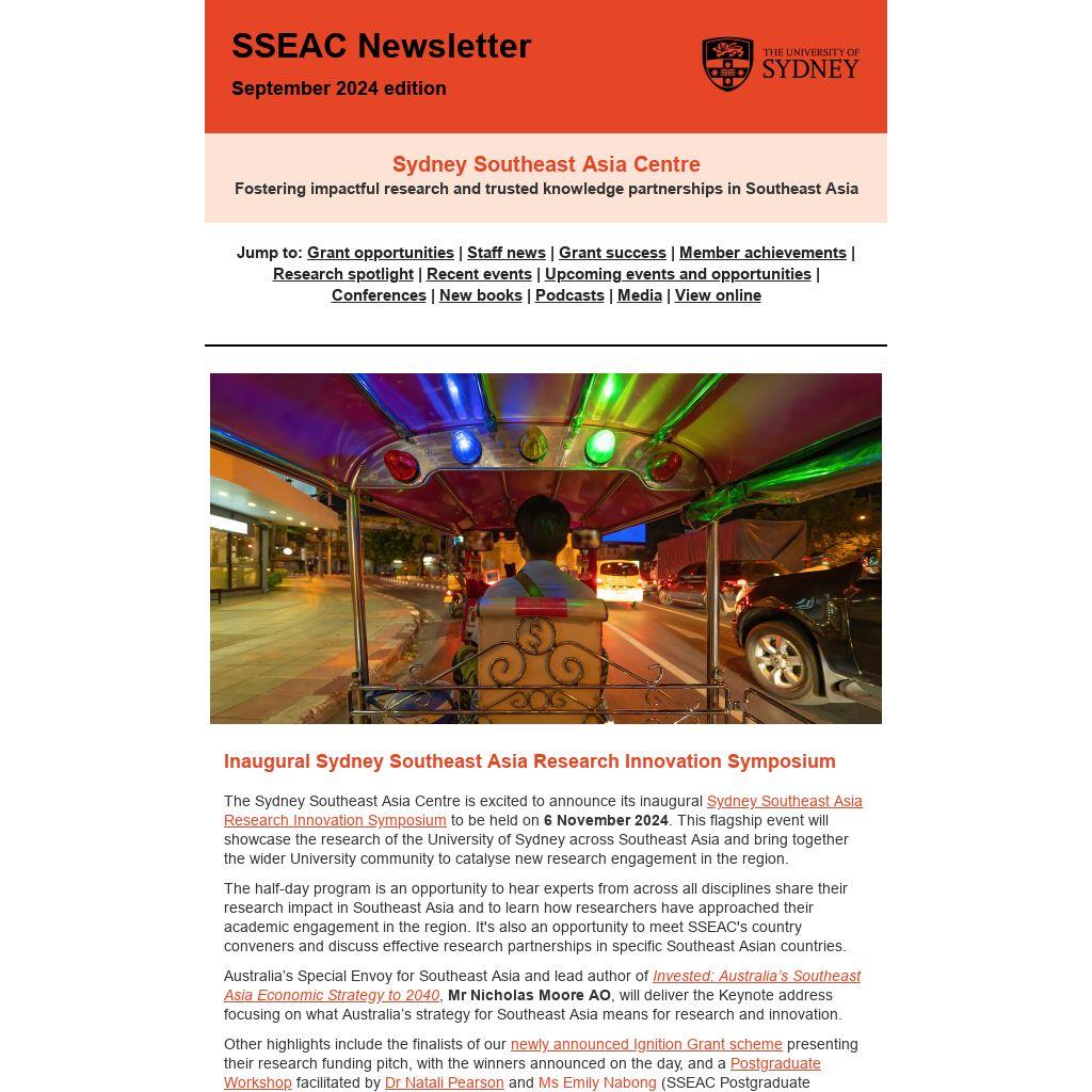 Inaugural Sydney Southeast Asia Research Innovation SymposiumThe Sydney Southeast Asia Centre is excited to announce its inaugural Sydney Southeast Asia Research Innovation Symposium to be held on 6 November 2024. This flagship event will showcase the research of the University of Sydney across Southeast Asia and bring together the wider University community to catalyse new research engagement in the region.