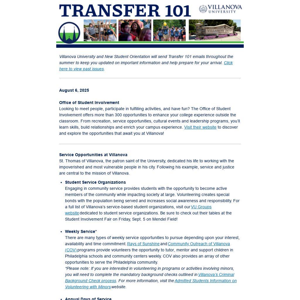 Villanova University and New Student Orientation will send Transfer 101 emails throughout the summer to keep you updated on important information and help prepare for your arrival. Click here to view past issues.