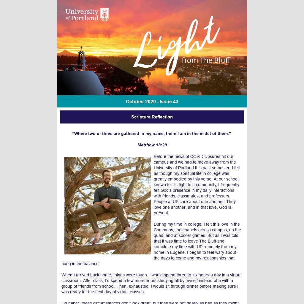 Before the news of COVID closures hit our campus and we had to move away from the University of Portland this past semester, I felt as though my spiritual life in college was greatly embodied by this verse. At our school, known for its tight-knit community, I frequently felt God’s presence in my daily interactions with friends, classmates, and professors. People at UP care about one another. They love one another, and in that love, God is present.