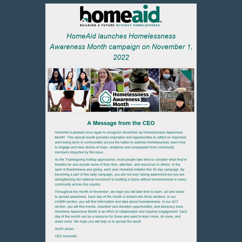 Join HomeAid during the month of November during our Homelessness Awareness Month campaign to Learn, Act, and Share, 30 Ways in 30 Days.