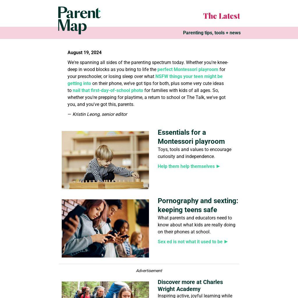 We're spanning all sides of the parenting spectrum today. Whether you're knee-deep in wood blocks as you bring to life the perfect Montessori playroom for your preschooler, or losing sleep over what NSFW things your teen might be getting into on their phone, we’ve got tips for both, plus some very cute ideas to nail that first-day-of-school photo for families with kids of all ages. So, whether you're prepping for playtime, a return to school or The Talk, we've got you, and you've got this, parents.