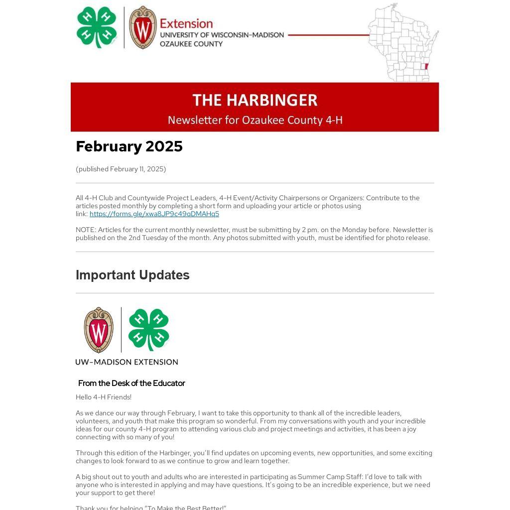 Harbinger Newsletter Published Monthly. The 4-H Harbinger newsletter will be published monthly on the second Tuesday of each month. Please adjust your 4-H club, group, and project announcement schedules as needed.