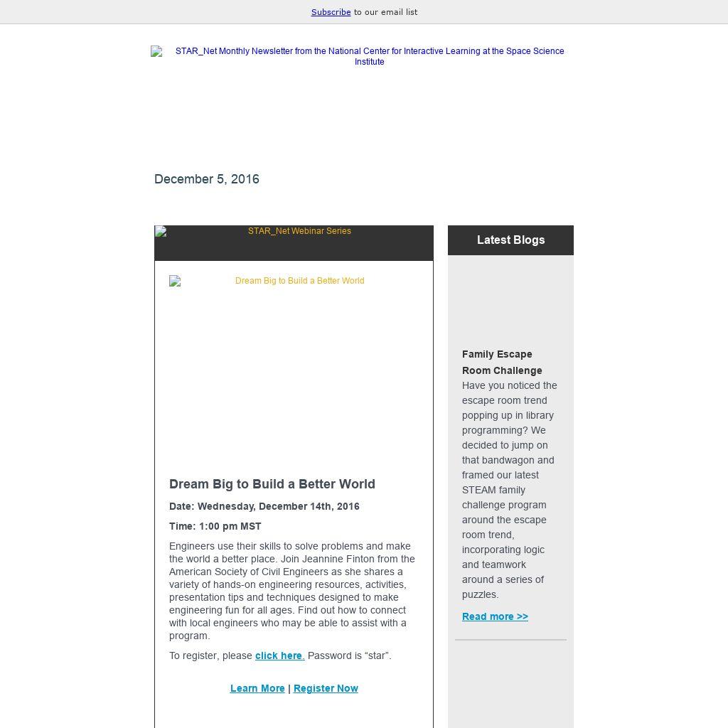 Dream Big to Build a Better World Date: Wednesday, December 14th, 2016 Time: 1:00 pm MST Engineers use their skills to solve problems and make the world a better place. Join Jeannine Finton from the American Society of Civil Engineers as she shares a variety of hands-on engineering resources, activities, presentation tips and techniques designed to make engineering fun for all ages. Find out how to connect with local engineers who may be able to assist with a program.