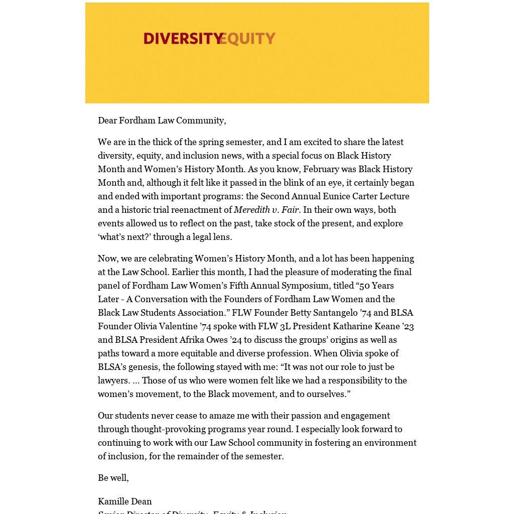 We are in the thick of the spring semester, and I am excited to share the latest diversity, equity, and inclusion news, with a special focus on Black History Month and Women’s History Month. As you know, February was Black History Month and, although it felt like it passed in the blink of an eye, it certainly began and ended with important programs: the Second Annual Eunice Carter Lecture and a historic trial reenactment of Meredith v. Fair. In their own ways, both events allowed us to reflect on the past, take stock of the present, and explore ‘what’s next?’ through a legal lens.