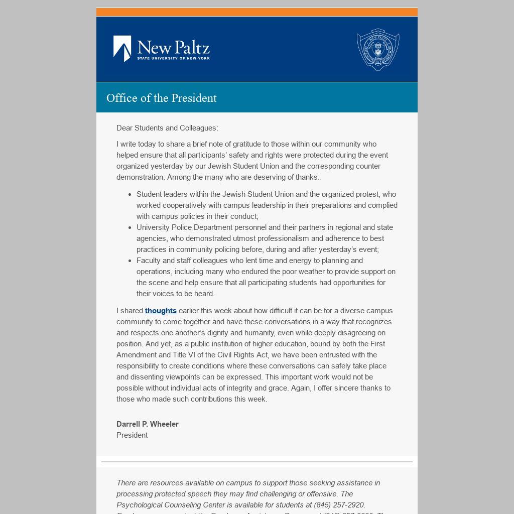 I write today to share a brief note of gratitude to those within our community who helped ensure that all participants’ safety and rights were protected during the event organized yesterday by our Jewish Student Union and the corresponding counter demonstration. Among the many who are deserving of thanks: