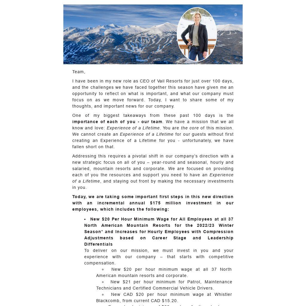 I have been in my new role as CEO of Vail Resorts for just over 100 days, and the challenges we have faced together this season have given me an opportunity to reflect on what is important, and what our company must focus on as we move forward. Today, I want to share some of my thoughts, and important news for our company.