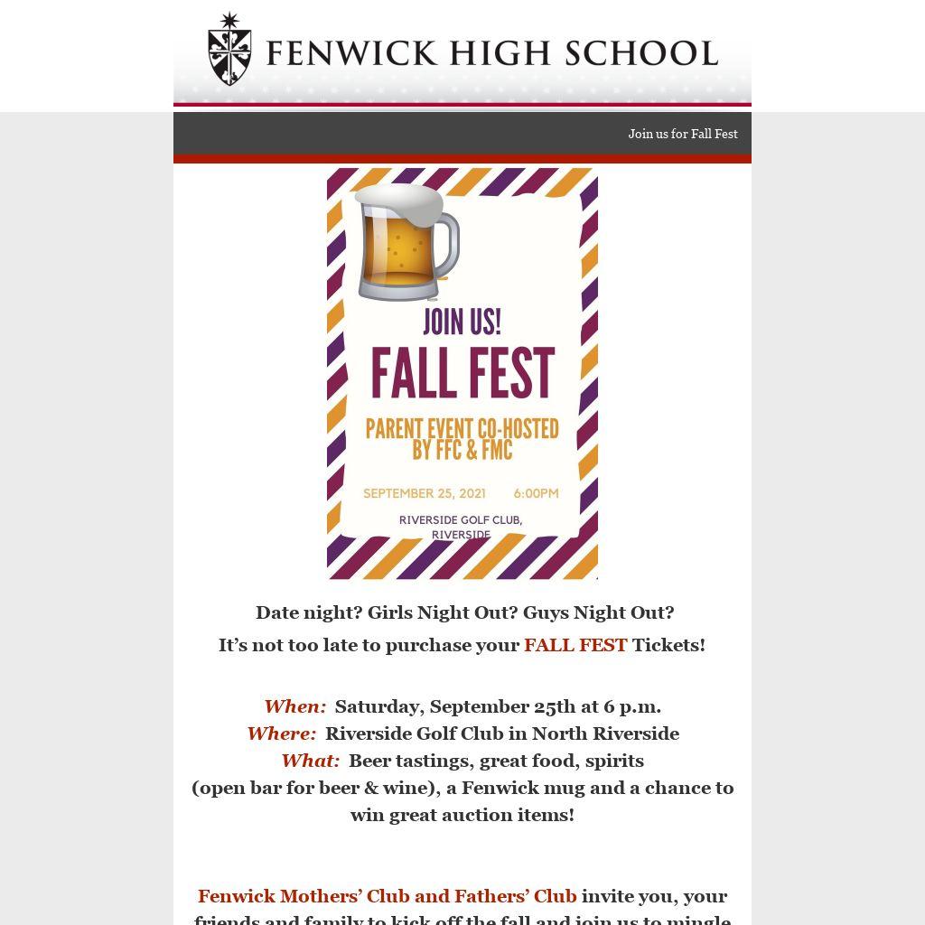 Fenwick Mothers’ Club and Fathers’ Club invite you, your friends and family to kick off the fall and join us to mingle with old friends and meet new ones.