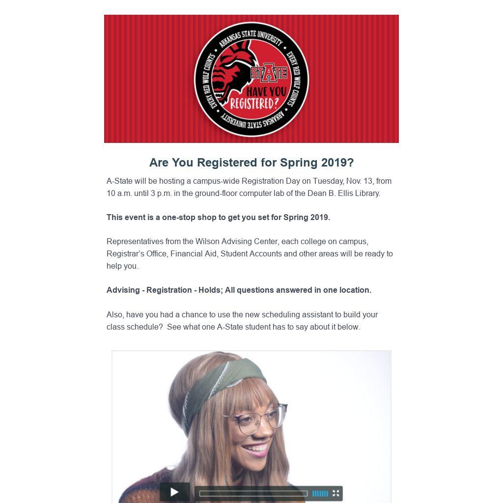 A-State will be hosting a campus-wide Registration Day on Tuesday, Nov. 13, from 10 a.m. until 3 p.m. in the ground-floor computer lab of the Dean B. Ellis Library.