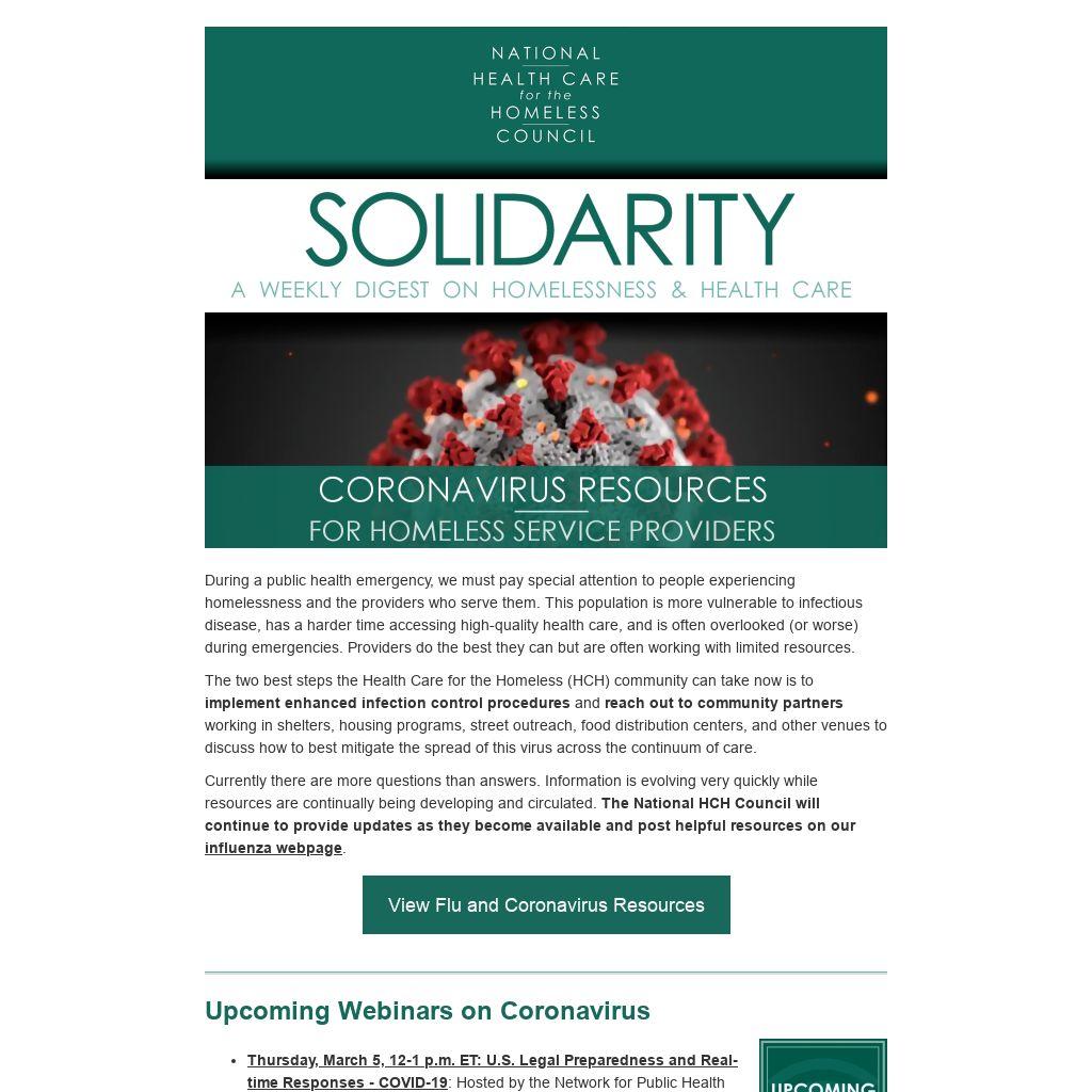 The two best steps the Health Care for the Homeless (HCH) community can take now is to implement enhanced infection control procedures and reach out to community partners working in shelters, housing programs, street outreach, food distribution centers, and other venues to discuss how to best mitigate the spread of this virus across the continuum of care.