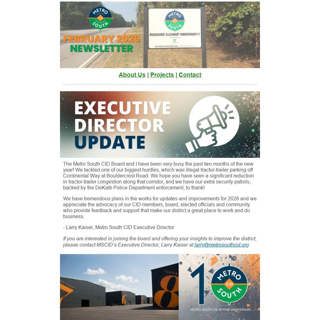 The Metro South CID Board and I have been very busy the past two months of the new year! We tackled one of our biggest hurdles, which was illegal tractor-trailer parking off Continental Way at Bouldercrest Road. We hope you have seen a significant reduction in tractor-trailer congestion along that corridor, and we have our extra security patrols, backed by the DeKalb Police Department enforcement, to thank!