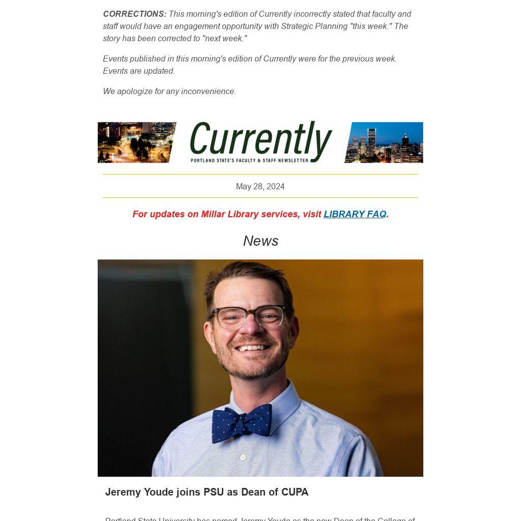 CURRENTLY is a weekly newsletter for the employees of Portland State University, published by University Communications. News items, events and accolades should be sent to currently@pdx.edu. Deadline is noon, the Tuesday before publication. See the Currently website for submission guidelines and schedule.