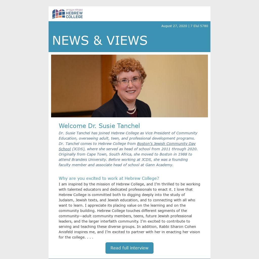 Welcome Dr. Susie Tanchel Dr. Susie Tanchel has joined Hebrew College as Vice President of Community Education, overseeing adult, teen, and professional development programs. Dr. Tanchel comes to Hebrew College from Boston’s Jewish Community Day School (JCDS), where she served as head of school from 2011 through 2020. Originally from Cape Town, South Africa, she moved to Boston in 1988 to attend Brandeis University. Before working at JCDS, she was a founding faculty member and associate head of school at Gann Academy.