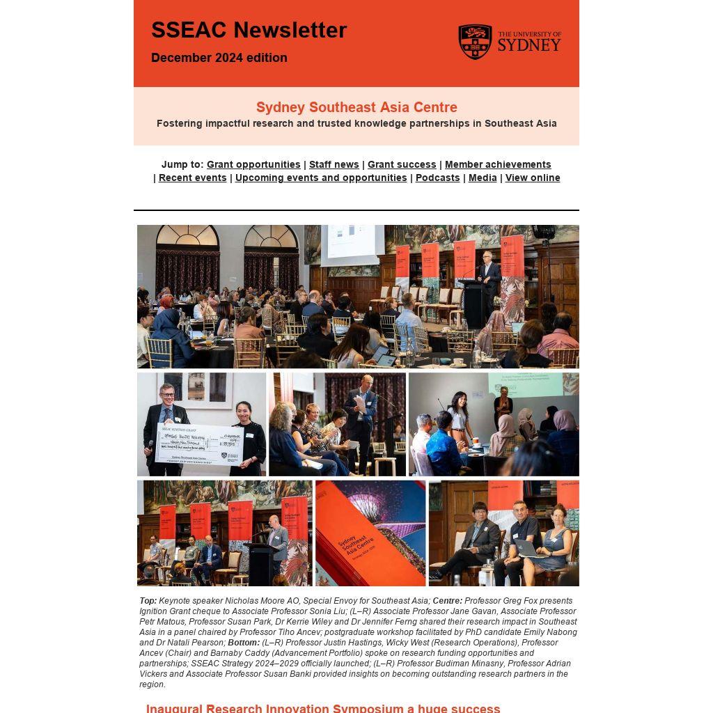 | Top: Keynote speaker Nicholas Moore AO, Special Envoy for Southeast Asia; Centre: Professor Greg Fox presents Ignition Grant cheque to Associate Professor Sonia Liu; (L–R) Associate Professor Jane Gavan, Associate Professor Petr Matous, Professor Susan Park, Dr Kerrie Wiley and Dr Jennifer Ferng shared their research impact in Southeast Asia in a panel chaired by Professor Tiho Ancev; postgraduate workshop facilitated by PhD candidate Emily Nabong and Dr Natali Pearson; Bottom: (L–R) Professor Justin Hastings, Wicky West (Research Operations), Professor Ancev (Chair) and Barnaby Caddy (Advancement Portfolio) spoke on research funding opportunities and partnerships; SSEAC Strategy 2024–2029 officially launched; (L–R) Professor Budiman Minasny, Professor Adrian Vickers and Associate Professor Susan Banki provided insights on becoming outstanding research partners in the region.