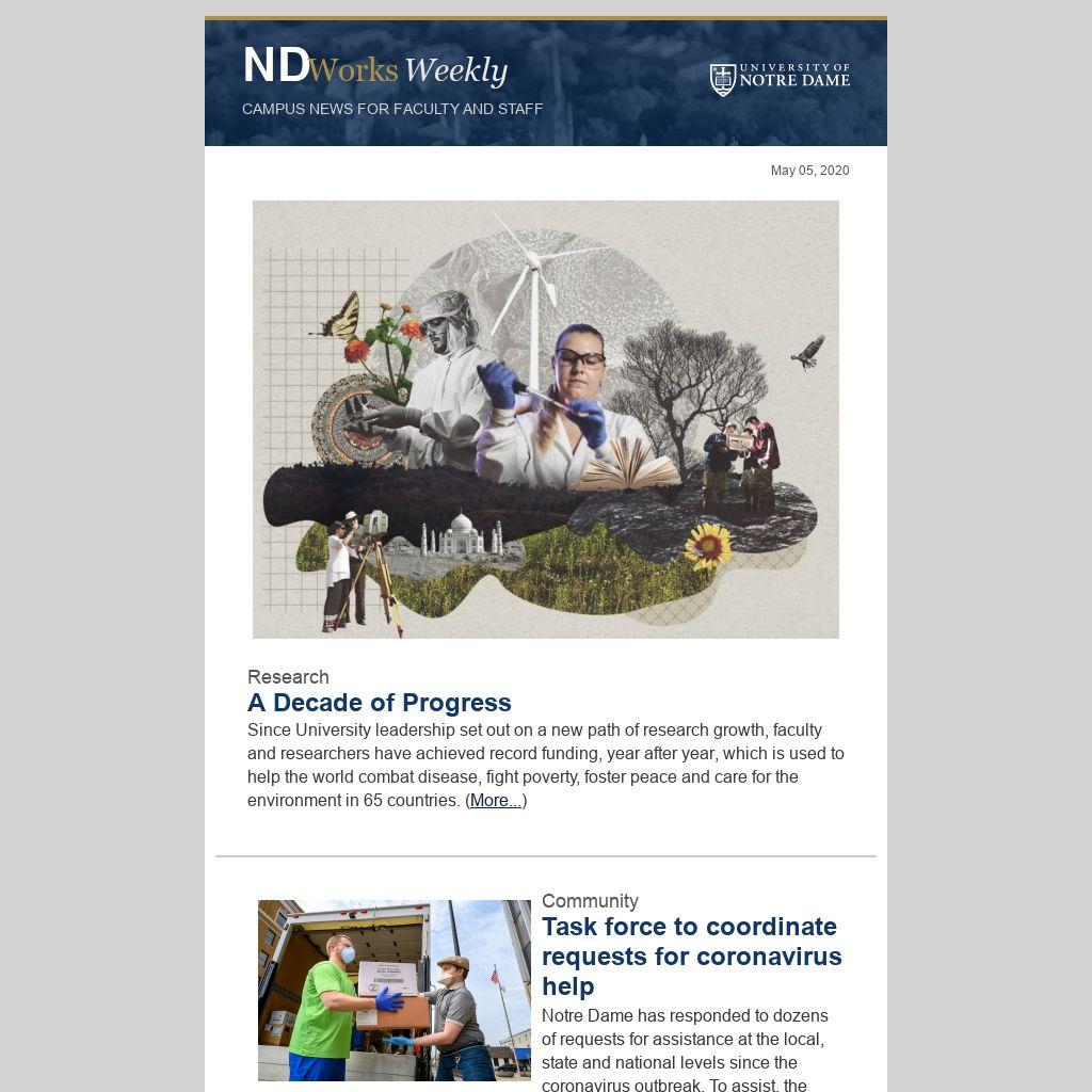 Notre Dame has responded to dozens of requests for assistance at the local, state and national levels since the coronavirus outbreak. To assist, the University has formed a task force to meet demand. (More...)