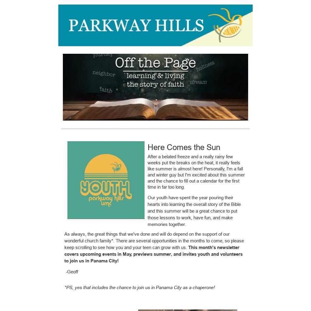 In the coming weeks you'll receive a calendar with all the summer opportunities at Parkway Hills, but first let's cover youth events so you can get them on your calendars. We have some events which will reoccure at a regular pattern to make things simple, with room for some special events as well.