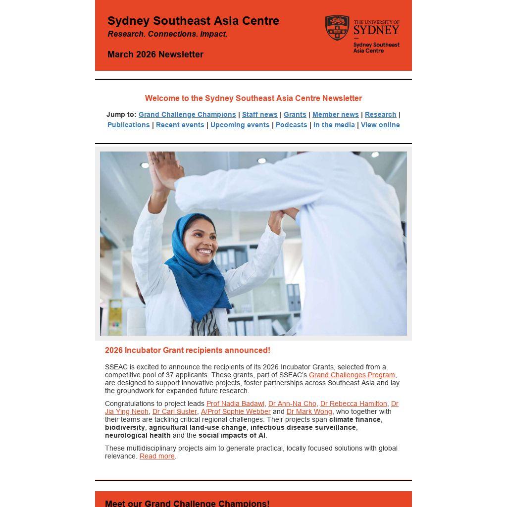 We’re now seeking Grand Challenge Champions for two further themes: “ Climate change resilience and the clean energy transition” and “ Shared pasts and shared futures”, and a second Grand Champion for “ Digital transformation and AI”. If you're a University of Sydney academic and want to get involved and help shape Southeast Asia’s future, see the terms of reference and contact sseac@sydney.edu.au.