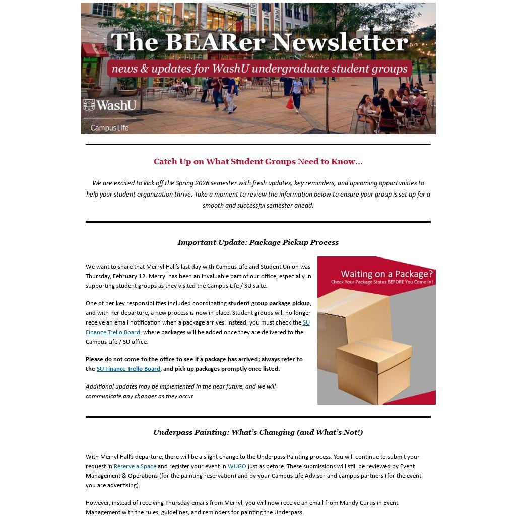 We are excited to kick off the Spring 2026 semester with fresh updates, key reminders, and upcoming opportunities to help your student organization thrive. Take a moment to review the information below to ensure your group is set up for a smooth and successful semester ahead.