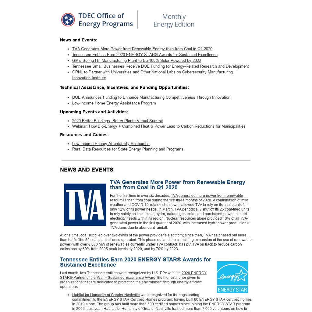 For the first time in over six decades, TVA generated more power from renewable resources than from coal during the first three months of 2020. A combination of mild weather and COVID-19-related shutdowns allowed TVA to rely on its coal plants for only 12% of its power needs. In March, TVA periodically shut off its 25 coal-fired units to rely solely on its nuclear, hydro, natural gas, solar, and purchased power to meet electricity needs within its region. Nuclear resources alone provided 43% of all TVA-generated power in the first quarter of 2020, with increased hydropower production at TVA dams due to abundant rainfall.