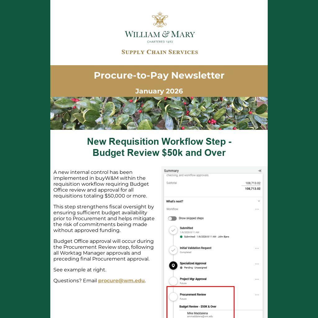 A new internal control has been implemented in buyW&M within the requisition workflow requiring Budget Office review and approval for all requisitions totaling $50,000 or more.