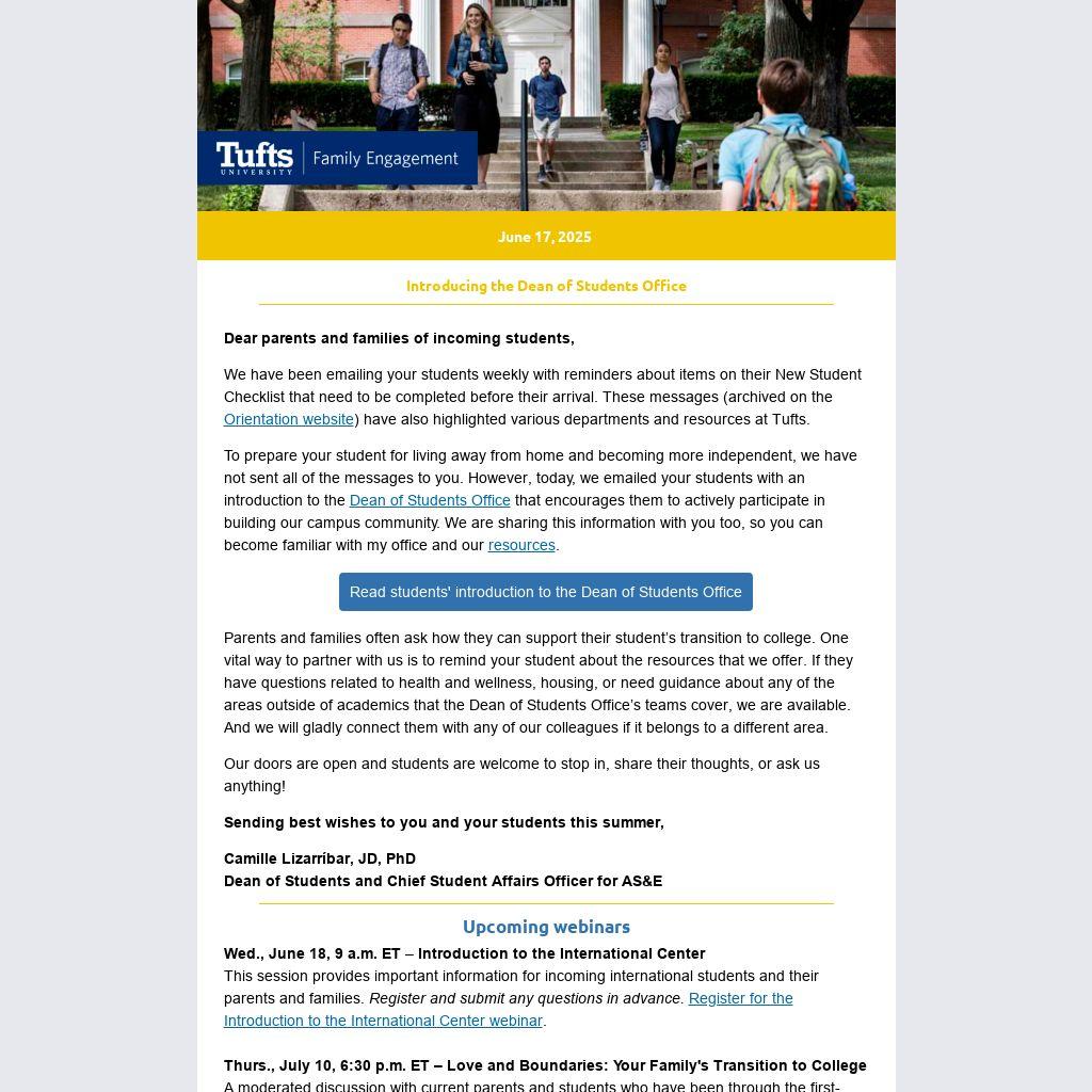 Parents and families often ask how they can support their student’s transition to college. One vital way to partner with us is to remind your student about the resources that we offer. If they have questions related to health and wellness, housing, or need guidance about any of the areas outside of academics that the Dean of Students Office’s teams cover, we are available. And we will gladly connect them with any of our colleagues if it belongs to a different area.