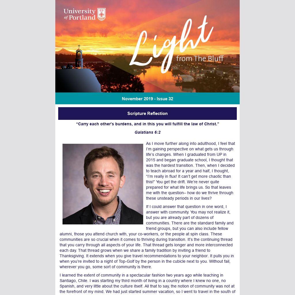 One consistent lesson that I experienced at UP was that community is a pillar of Catholicism. One passage that alludes to this is from Galatians, “Carry each other’s burdens, and in this you will fulfill the law of Christ.” God is truly present in community, because love thrives in community. When we take on other’s burdens, such as supporting someone during a period of change, we are doing God’s work in its most basic form. When you find yourself in the middle of a transition, I urge you to build your community first, get invested, and say yes to those connections. Then, when it comes time to support someone or be supported, your foundation is already sound. Trust your neighbor and help your neighbor, and you will thrive.