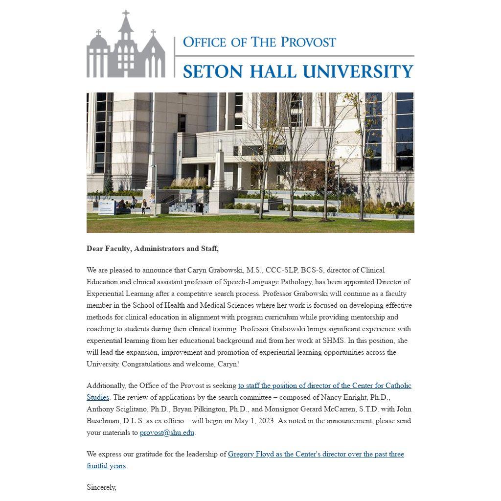 Additionally, the Office of the Provost is seeking to staff the position of director of the Center for Catholic Studies. The review of applications by the search committee – composed of Nancy Enright, Ph.D., Anthony Sciglitano, Ph.D., Bryan Pilkington, Ph.D., and Monsignor Gerard McCarren, S.T.D. with John Buschman, D.L.S. as ex officio – will begin on May 1, 2023. As noted in the announcement, please send your materials to provost@shu.edu.