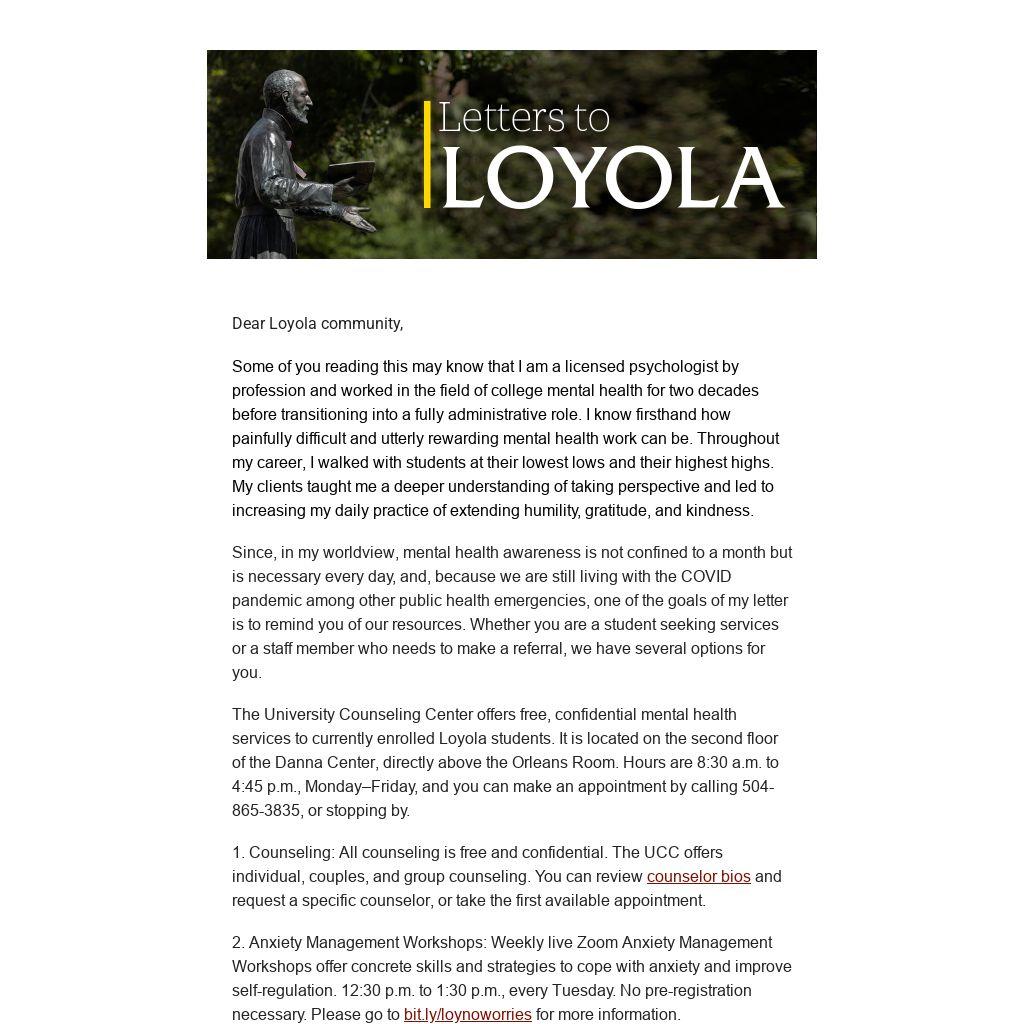 Faculty and staff colleagues, thank you for your partnership through the years in assisting students with getting connected. Please continue to share your BIT reports and other situations that need intervention so that we can continue providing wrap-around care for the community. As always, please send students who need excuse notes to studentaffairs@loyno.edu for assistance.