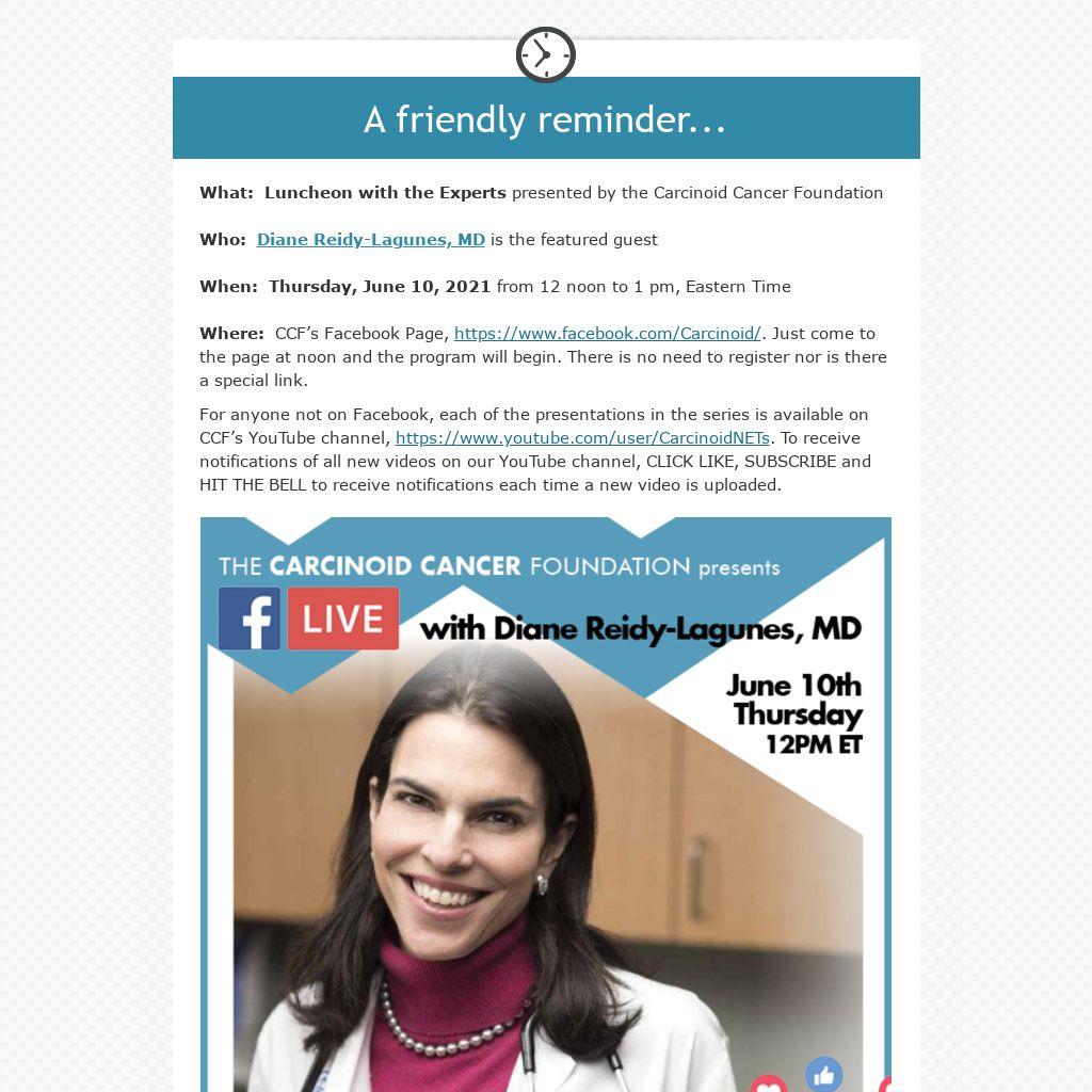 For anyone not on Facebook, each of the presentations in the series is available on CCF’s YouTube channel, https://www.youtube.com/user/CarcinoidNETs. To receive notifications of all new videos on our YouTube channel, CLICK LIKE, SUBSCRIBE and HIT THE BELL to receive notifications each time a new video is uploaded.