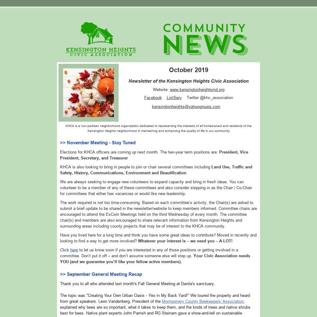 The work required is not too time-consuming. Based on each committee’s activity, the Chair(s) are asked to submit a brief update to be shared in the newsletter/website to keep members informed. Committee chairs are encouraged to attend the ExCom Meetings held on the third Wednesday of every month. The committee chair(s) and members are also encouraged to share relevant information from Kensington Heights and surrounding areas including county projects that may be of interest to the KHCA community.