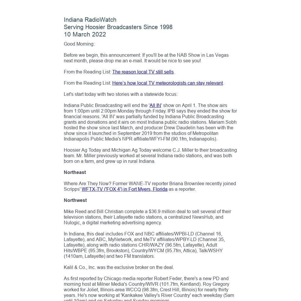 Indiana RadioWatch subscriptions are free. To subscribe, send an e-mail to irw@well.com and we'll add you. After publication, we archive Indiana RadioWatch on the Indiana Radio Archive at indianaradio.net. Please e-mail us your news stories and employment opportunities.