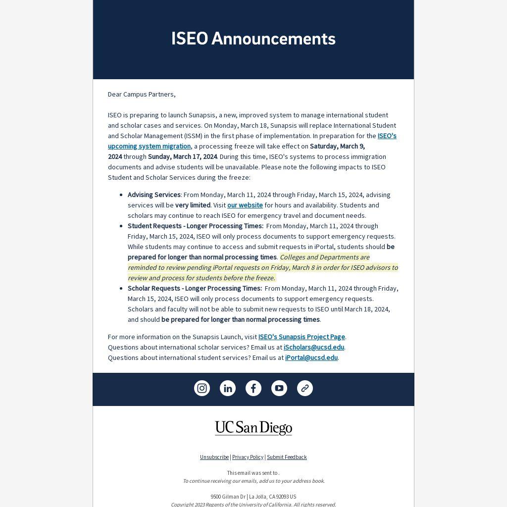 ISEO is preparing to launch Sunapsis, a new, improved system to manage international student and scholar cases and services. On Monday, March 18, Sunapsis will replace International Student and Scholar Management (ISSM) in the first phase of implementation. In preparation for the ISEO's upcoming system migration, a processing freeze will take effect on Saturday, March 9, 2024 through Sunday, March 17, 2024. During this time, ISEO's systems to process immigration documents and advise students will be unavailable. Please note the following impacts to ISEO Student and Scholar Services during the freeze: