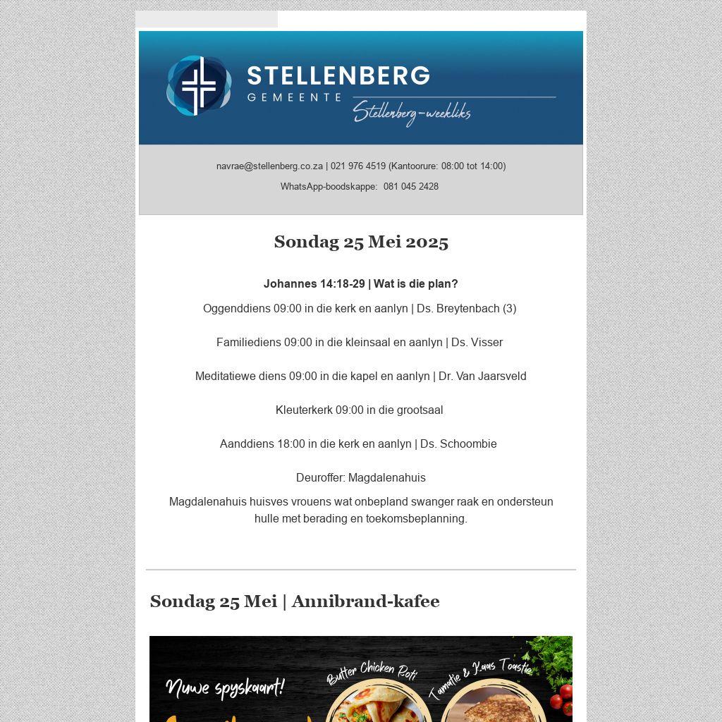 Plaas gerus ’n advertensie in die Stellenberg-weekliks. Die nuusblad word tans weekliks elektronies aan 2 500 persone gestuur en is ook op die gemeente se webwerf beskikbaar. Advertensies sal slegs aanlyn beskikbaar wees en word nie in gedrukte formaat uitgegee nie. Lees meer . . .