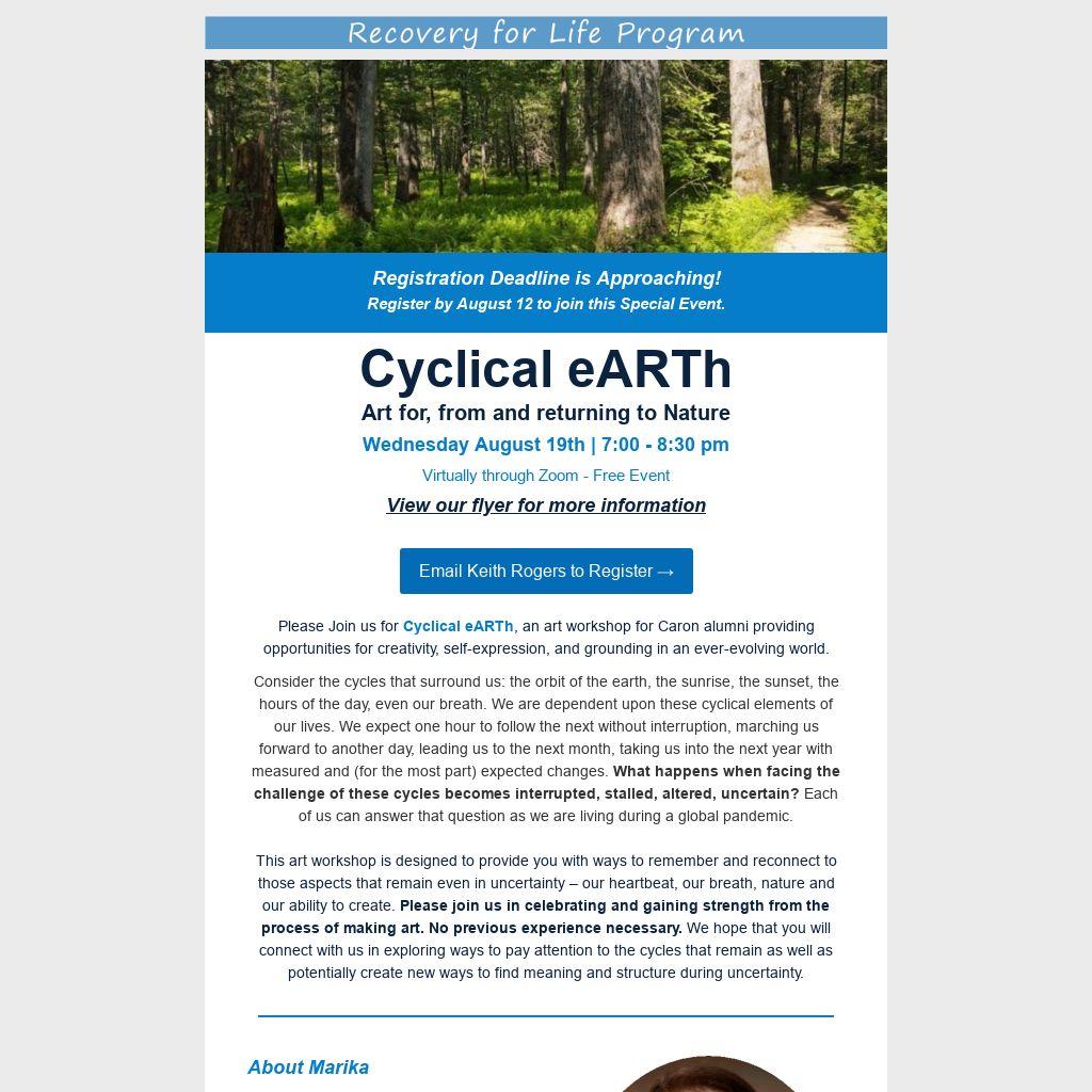 Please Join us for Cyclical eARTh, an art workshop for Caron alumni providing opportunities for creativity, self-expression, and grounding in an ever-evolving world.