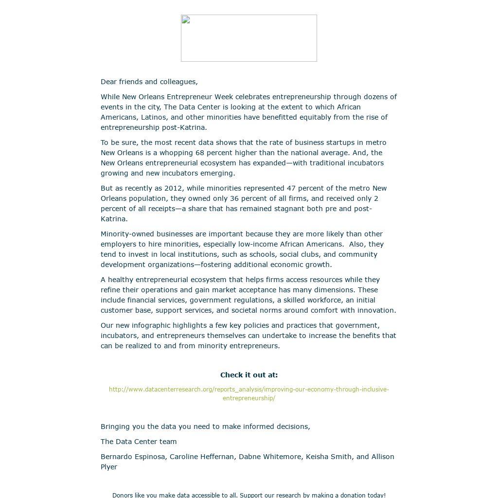 While New Orleans Entrepreneur Week celebrates entrepreneurship through dozens of events in the city, The Data Center is looking at the extent to which African Americans, Latinos, and other minorities have benefitted equitably from the rise of entrepreneurship post-Katrina.