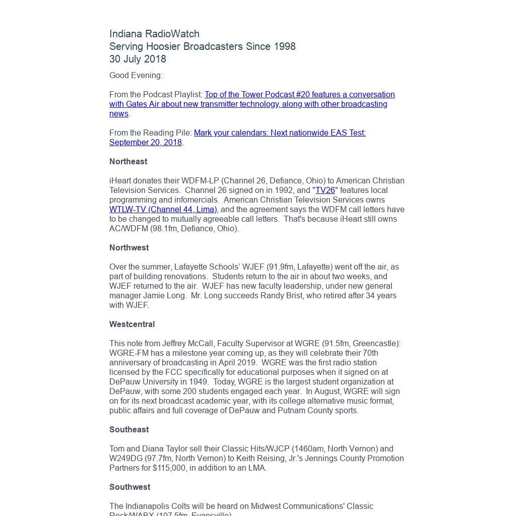 Indiana RadioWatch subscriptions are free. To subscribe, send an e-mail to irw@well.com and we'll add you. After publication, we archive Indiana RadioWatch on the Indiana Radio Archive at http://www.indianaradio.net. Please e-mail us your news stories and employment opportunities.