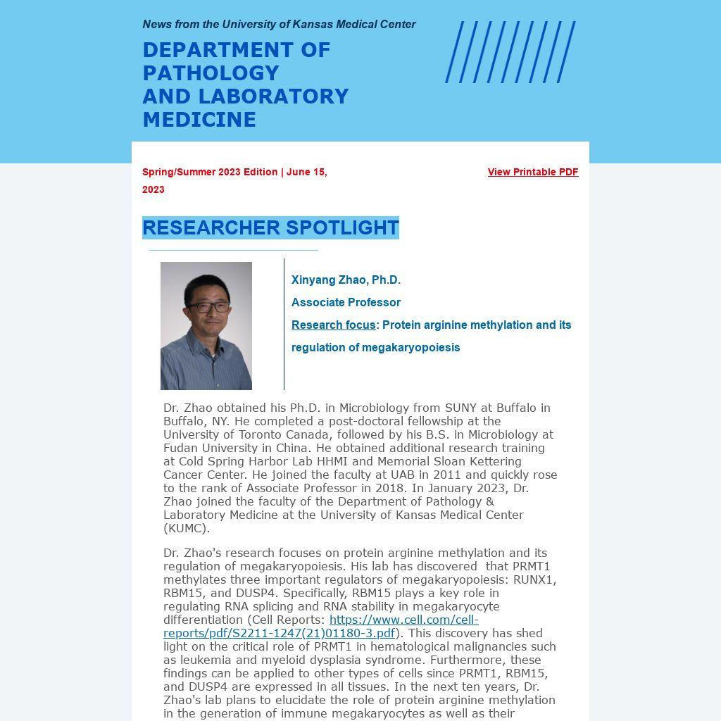 Dr. Wei Zhang will serve as the Medical Director of Molecular Pathology in Surgical Pathology in the Department of Pathology & Laboratory Medicine at the University of Kansas Medical Center (KUMC), effective July 1, 2023.