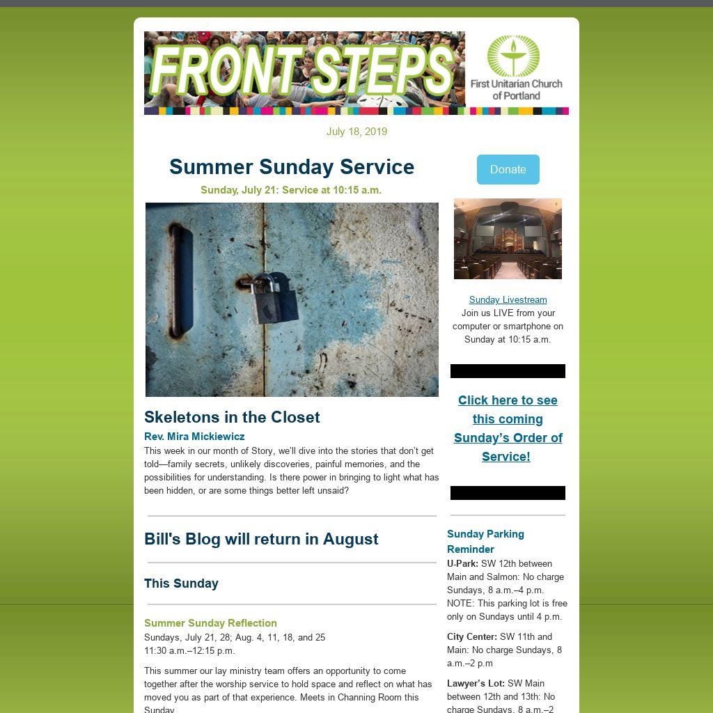 Do You Have an Item for E-news and/or the Sunday Bulletin?If you have an item you’d like published in our weekly Front Steps (eNews) or the Sunday Bulletin, please submit it to: