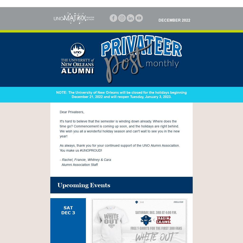 If you need information on making a gift during the holiday season, visit give.uno.edu.