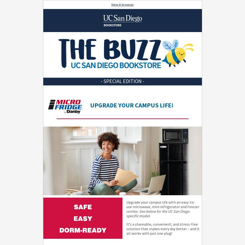 | Upgrade your campus life with an easy-to-use microwave, mini refrigerator and freezer combo. See below for the UC San Diego-specific model.Β