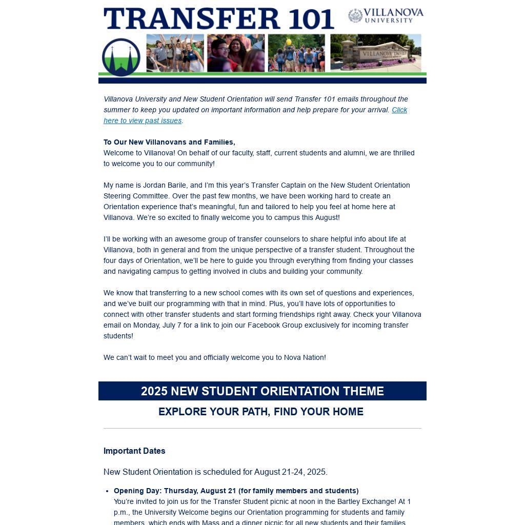 Villanova University and New Student Orientation will send Transfer 101 emails throughout the summer to keep you updated on important information and help prepare for your arrival. Click here to view past issues.