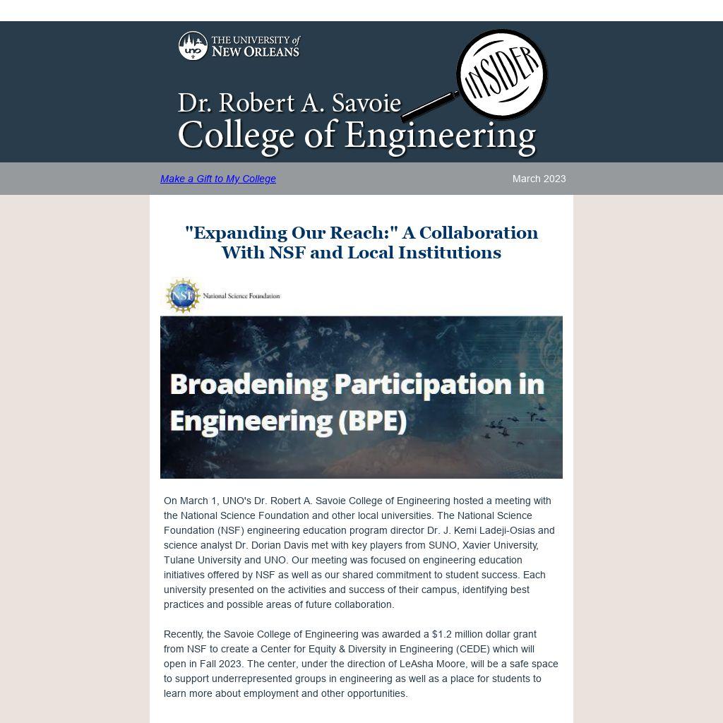 On March 1, UNO's Dr. Robert A. Savoie College of Engineering hosted a meeting with the National Science Foundation and other local universities. The National Science Foundation (NSF) engineering education program director Dr. J. Kemi Ladeji-Osias and science analyst Dr. Dorian Davis met with key players from SUNO, Xavier University, Tulane University and UNO. Our meeting was focused on engineering education initiatives offered by NSF as well as our shared commitment to student success. Each university presented on the activities and success of their campus, identifying best practices and possible areas of future collaboration.