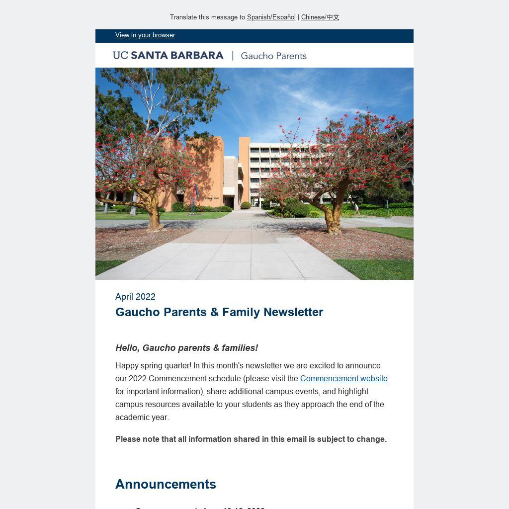 Happy spring quarter! In this month's newsletter we are excited to announce our 2022 Commencement schedule (please visit the Commencement website for important information), share additional campus events, and highlight campus resources available to your students as they approach the end of the academic year.