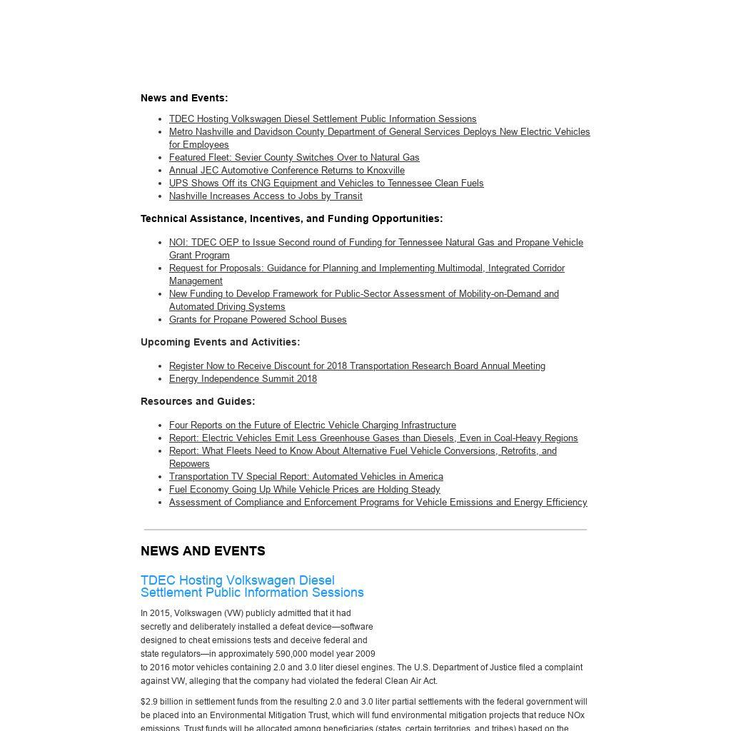 Tennessee’s initial, combined allocation under the approved 2.0 and 3.0 liter partial settlements is $45,759,914.40. The TDEC Office of Energy Programs (OEP), the lead agency administering the Volkswagen Diesel Settlement funds for TN, has been hosting public information sessions about the settlement. Sessions were previously held in Nashville on October 31, Knoxville on November 7, and Memphis on November 17. TDEC OEP will also hold a public information session in Chattanooga and via webinar in December (details will be released as they are available). These meetings will provide an overview of the VW Diesel Settlement, the Environmental Mitigation Trust, TDEC's process for developing a proposed Beneficiary Mitigation Plan for Tennessee, and the types of eligible mitigation actions that can be funded by Tennessee’s Environmental Mitigation Trust allocation.