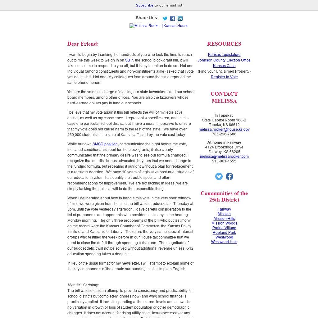 It is the Superintendent’s job to support the needs of his district. He is doing his job. I am elected to represent the people of the 25th District, however my job also requires me to carefully weigh the consequences of my decisions statewide. They call this “voting your conscience and your district.” Oftentimes, it is a delicate balance. In this case, I received several hundred emails from constituents – all parents and patrons of the district, asking me to oppose this bill. It represents one of those rare opportunities to vote both conscience and district together. I respectfully disagree with the SMSD position because I do not believe this action was the ONLY recourse available to address the concerns with the funding formula.