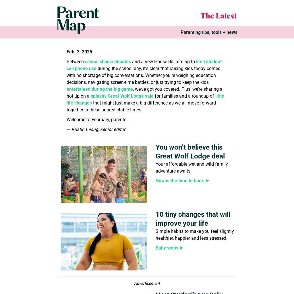 Between school choice debates and a new House Bill aiming to limit student cell phone use during the school day, it’s clear that raising kids today comes with no shortage of big conversations. Whether you’re weighing education decisions, navigating screen-time battles, or just trying to keep the kids entertained during the big game, we’ve got you covered. Plus, we’re sharing a hot tip on a splashy Great Wolf Lodge sale for families and a roundup of little life changes that might just make a big difference as we all move forward together in these unpredictable times.
