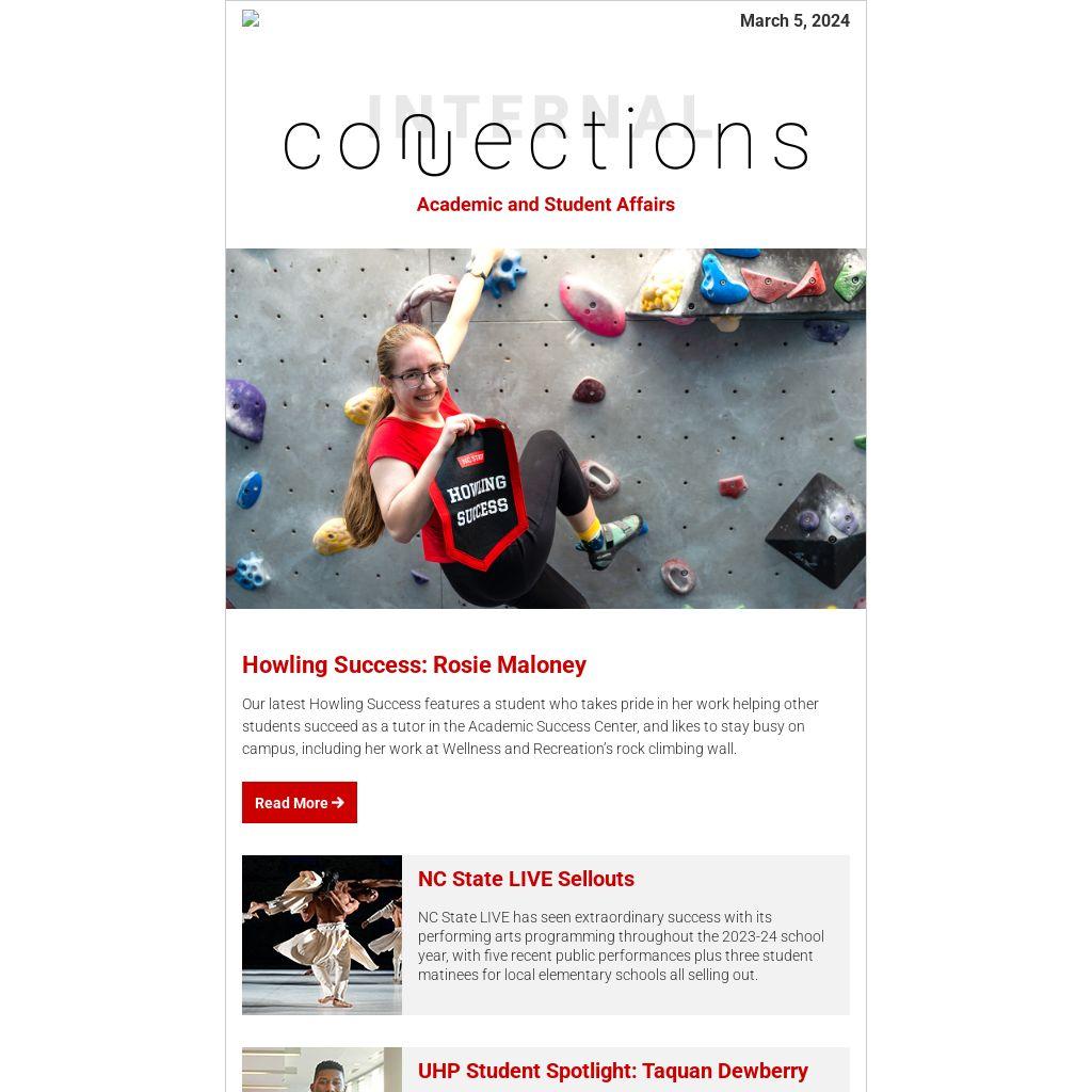 Our latest Howling Success features a student who takes pride in her work helping other students succeed as a tutor in the Academic Success Center, and likes to stay busy on campus, including her work at Wellness and Recreation’s rock climbing wall.