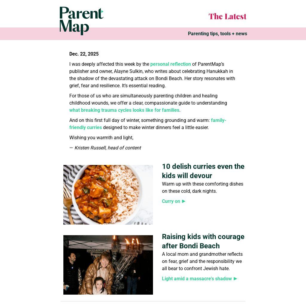 personal reflection of ParentMap’s publisher and owner, Alayne Sulkin, who writes about celebrating Hanukkah in the shadow of the devastating attack on Bondi Beach. Her story resonates with grief, fear and resilience. It’s essential reading.