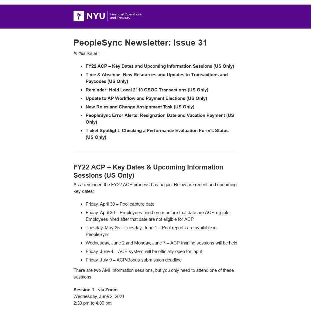 NYU’s contract with Local 2110 is currently being ratified for GSOC student hourly and non-hourly employees. Please hold off on processing any terminations in PeopleSync at the end of the spring 2021 semester as we may need to calculate a retro payment back to September 1, 2020, once the Local 2110 contract is finalized.